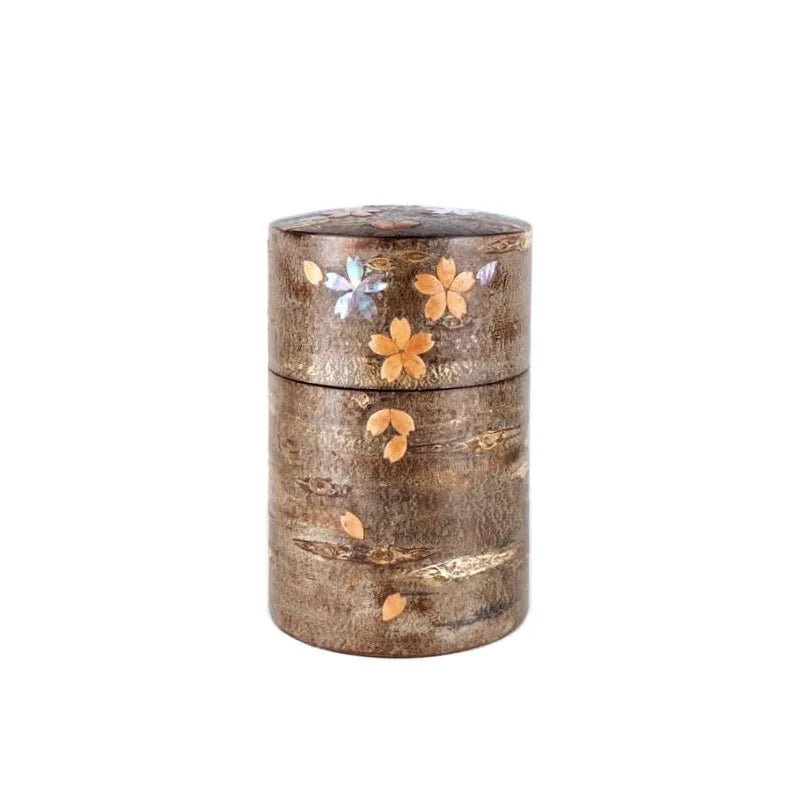 藤木伝四郎:34384 霜降桜皮茶筒 - 桜柄螺鈿総皮茶筒(中長)霜降皮貝入散花